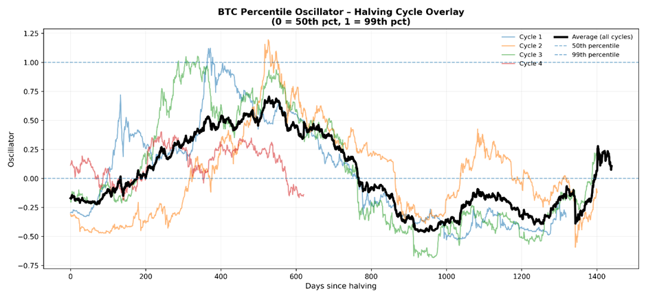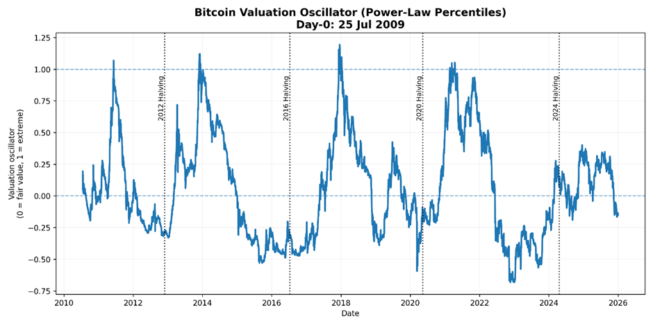We can then transform this into an oscillator (which equals 0 when the price is at the 50th percentile and 1 when it’s at the 99th percentile) to understand the cycles around the power-law trend.