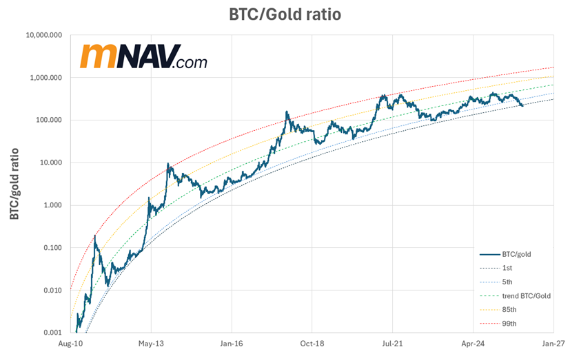 Right now, the power law trend for the gold inferred BTC price is $169k, while the: