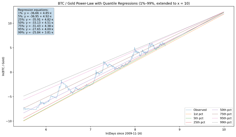 Similar to BTC/USD, BTC/gold also exhibits a power-law trend. When we optimise day 0 (16 November 2009), we get an R2 of 96%.