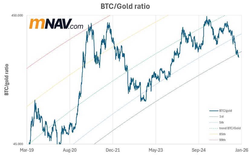 But, with gold ripping lately, Bitcoin hasn’t gone anywhere (in gold terms) for a couple of years. Either Bitcoin is structurally broken — or it has significant catching up to do once risk appetite returns.