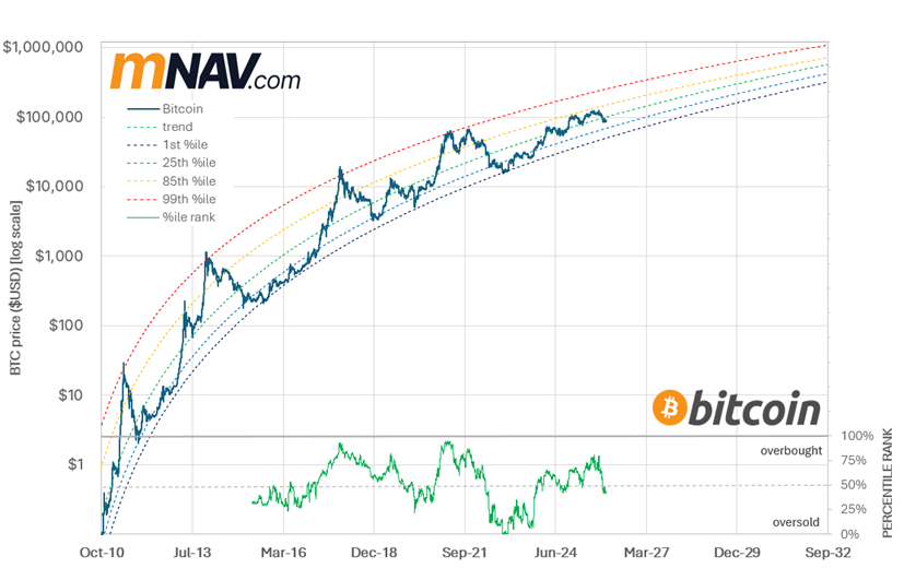 After running hot, it’s reasonable that Bitcoin is taking a breather. At present, it sits modestly below the optimised power‑law trend price of ~$100k, while the long‑term trend itself continues to compound at a very healthy 36% p.a.
