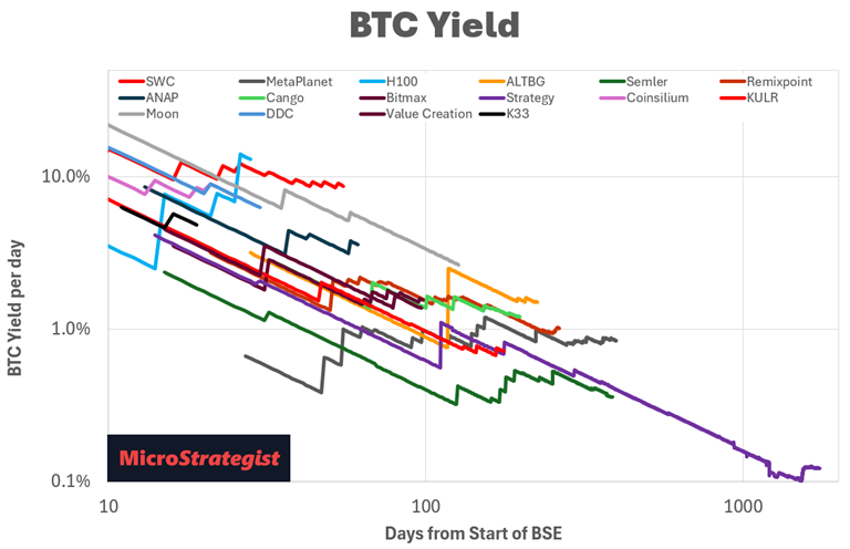 A great example of how to build a robust long-term BTC treasury is MetaPlanet, which has maintained a consistent BTC Yield of just under 1% for the long term.