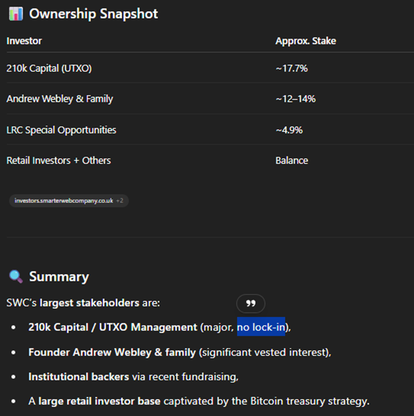 This is largely due to UTXO’s injection of funds, which amounts to an 18% stake (with no lock-in). It will be interesting to see if any of the major shareholders start to sell down their stake after they crash through the 1000 BTC target.
