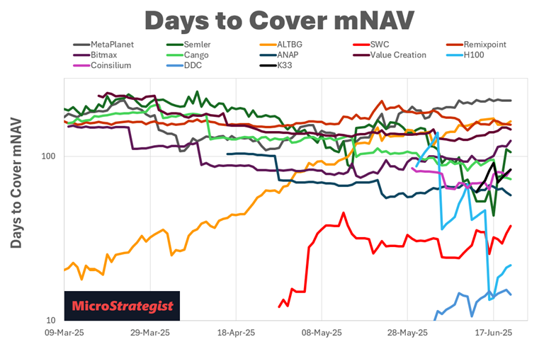 Both Strategy and MetaPlanet discussed the optimal mNAV window in their Q1 2025 earnings presentations. Strategy seems content to run the ATM at a mNAV > 2.0, but MetaPlanet’s target window is > 3.0.