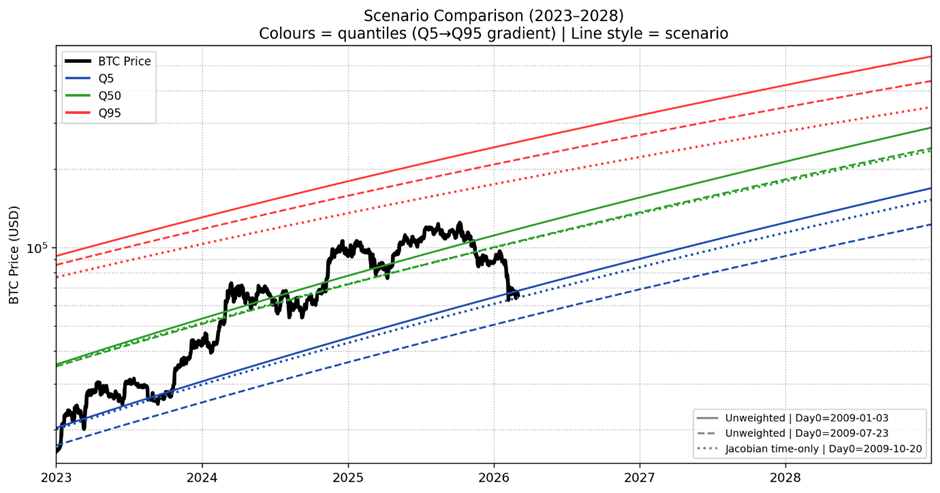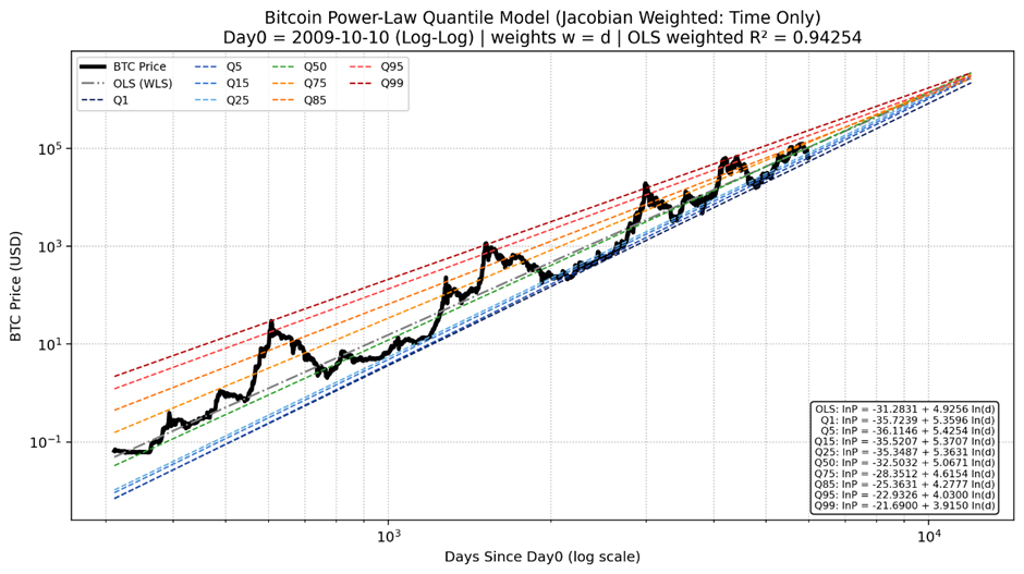 Jacobian weighting ensures that each year of Bitcoin’s history contributes equally to the regression, rather than letting the earliest years dominate the model.