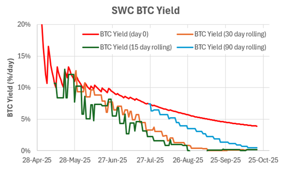 It’s normal for BTC Yield to slow, but a sudden change in stacking pace can be diabolical, leading to a rapid collapse in mNAV. The chart below shows SWC’s BTC Yield with different lookback periods. As detailed in this article, savvy investors seem to focus on the shorter yield lookback window, meaning they pivot aggressively on short-term trends.