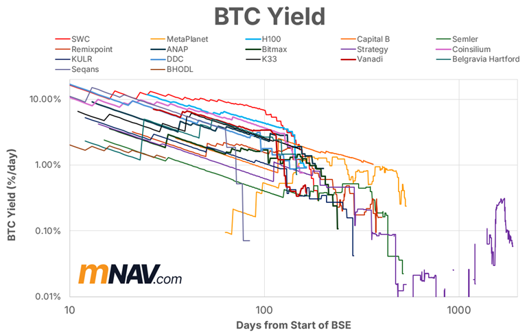 Accretive BTC-TCs that consistently stack sats earn a premium (higher mNAV). As a BTC-TC grows its stack, its yield naturally slows, and its mNAV drifts down.