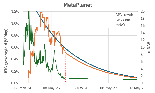 We can use the slowing Bitcoin growth rate to forecast the future decline in BTC Yield from current levels (as shown below for MetaPlanet). The inevitable slowing of the BTC growth rate helps us understand where BTC Yield might be headed.
