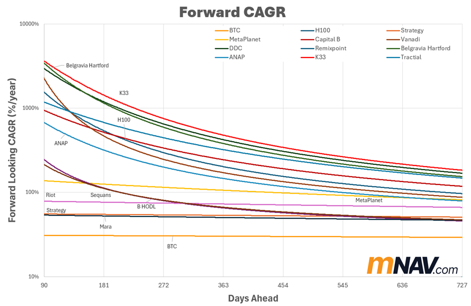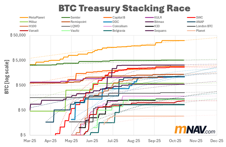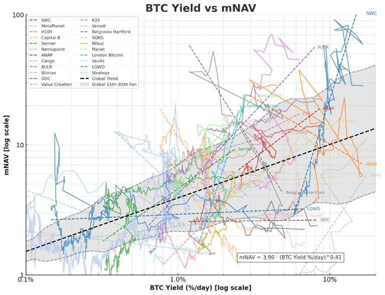 BTC-TCs are leveraged reflections of this curve. When Bitcoin rips, mNAVs expand as enthusiasm surges. When it stalls, multiples compress.