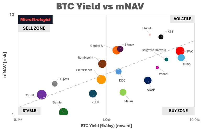 Many see the multiple of net asset value (mNAV) as simply a sentiment measure, but it’s closely correlated with BTC Yield. The relationship isn’t a 1:1, but companies with higher BTC Yield tend to have higher mNAV.