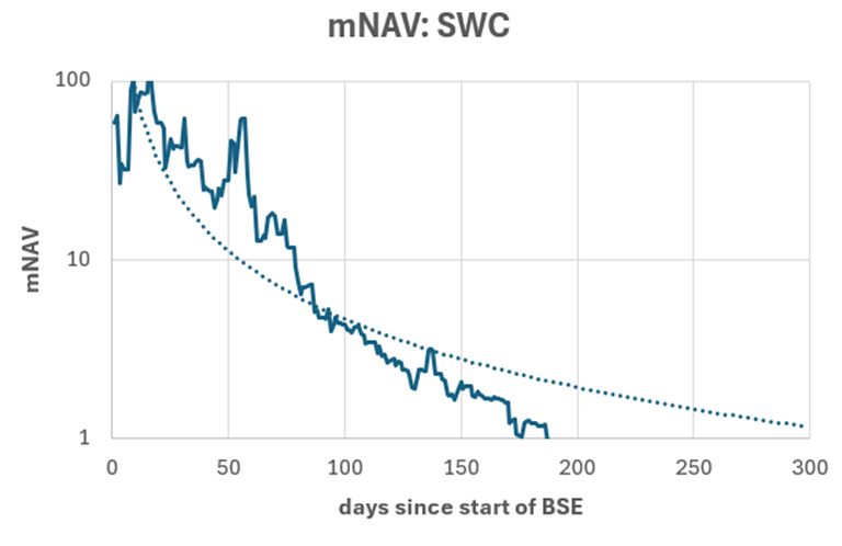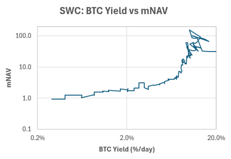 Meanwhile, we have no precedent for smaller companies that started with super-high BTC Yields and mNAV. For example, SWC’s mNAV has fallen from 100 to less than one over 180 days.