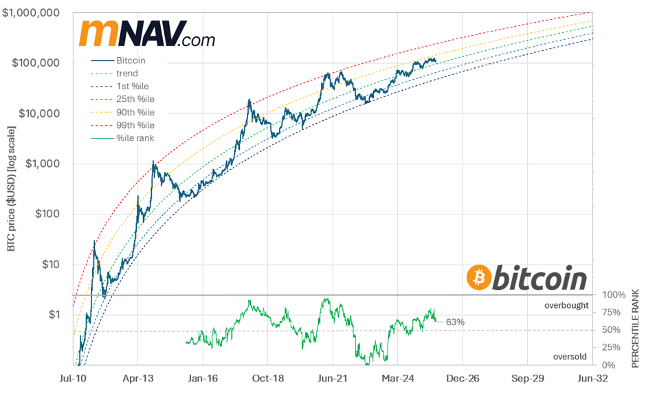 · BTC price follows a long-term power-law trend (currently ~37% CAGR).