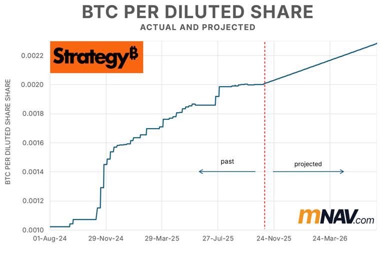 Example: Strategy has steadily increased BTC/share since 2020.