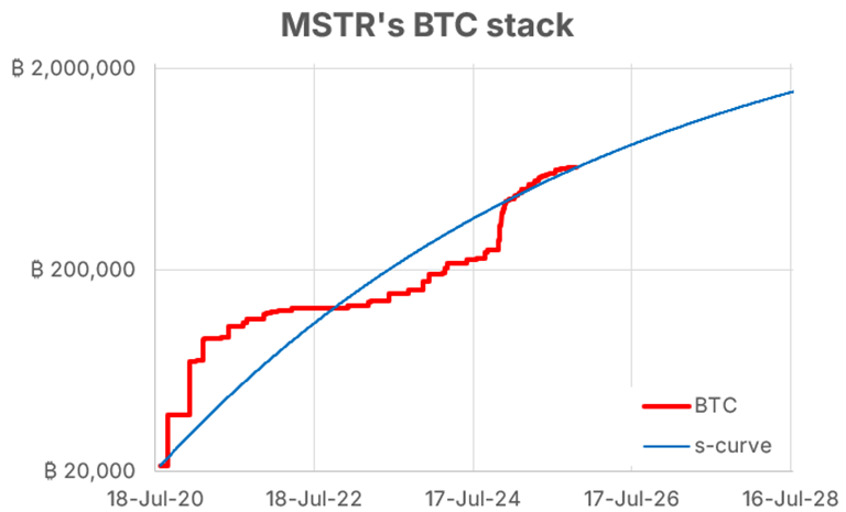 Similar to the power law for BTC, we can model a company’s BTC accumulation curve using a Gompertz regression, which accounts for the fact that stacking must slow down before reaching 21m BTC.