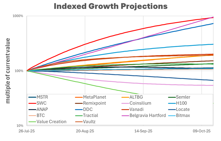 For SWC, our regression suggests an ultimate stack of ~12,800 BTC by late 2026 — a projection that we’ll refine as new data becomes available. A few recent solid BTC buys and a significant pullback in price now makes SWC look very attractive!