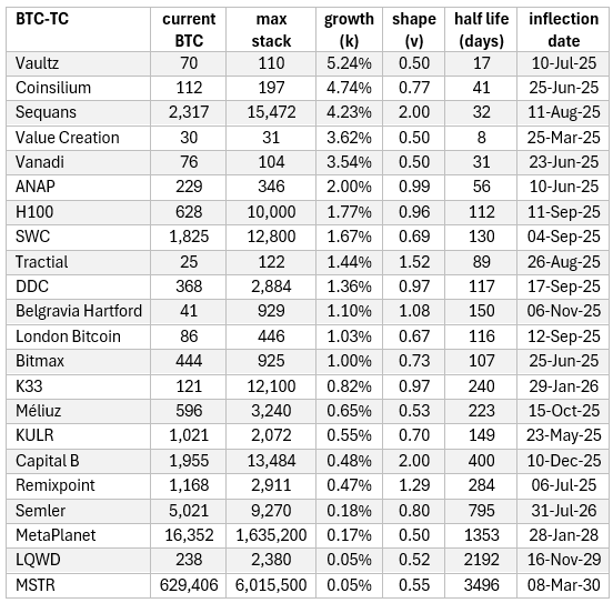 Here’s a look at actual BTC stacking data with the generalised Gompertz regression (a more gentle model than the more aggressive logistic regression).