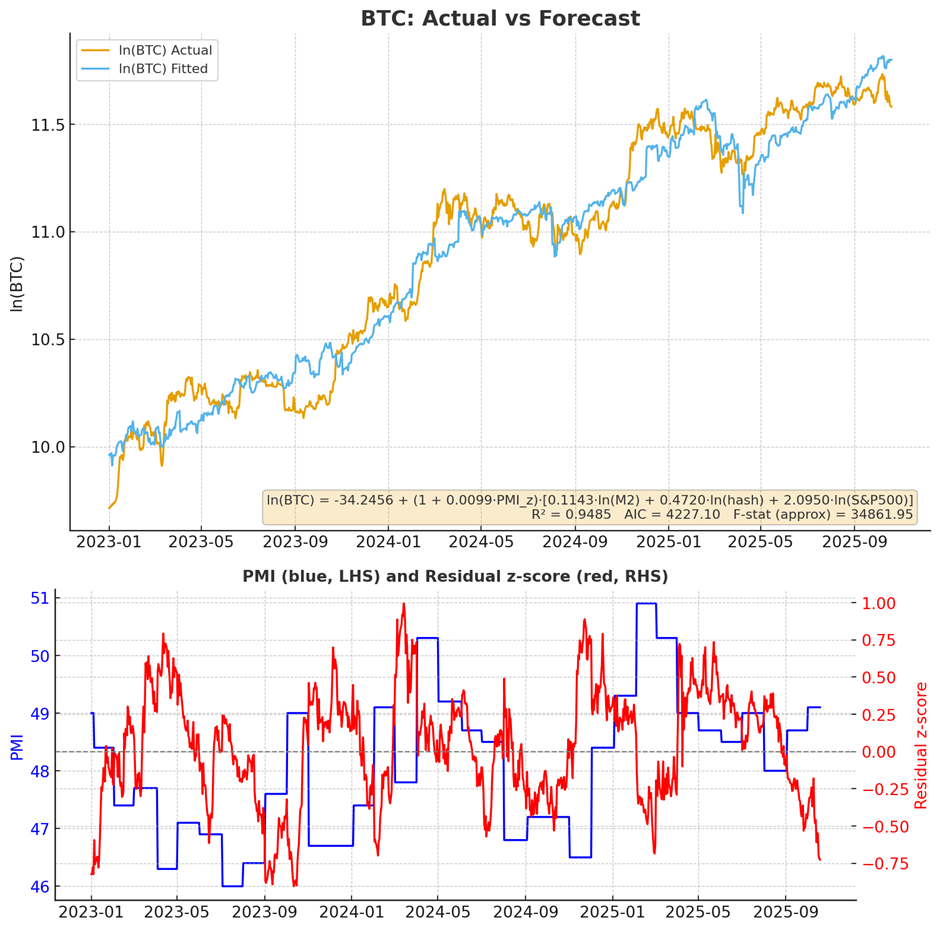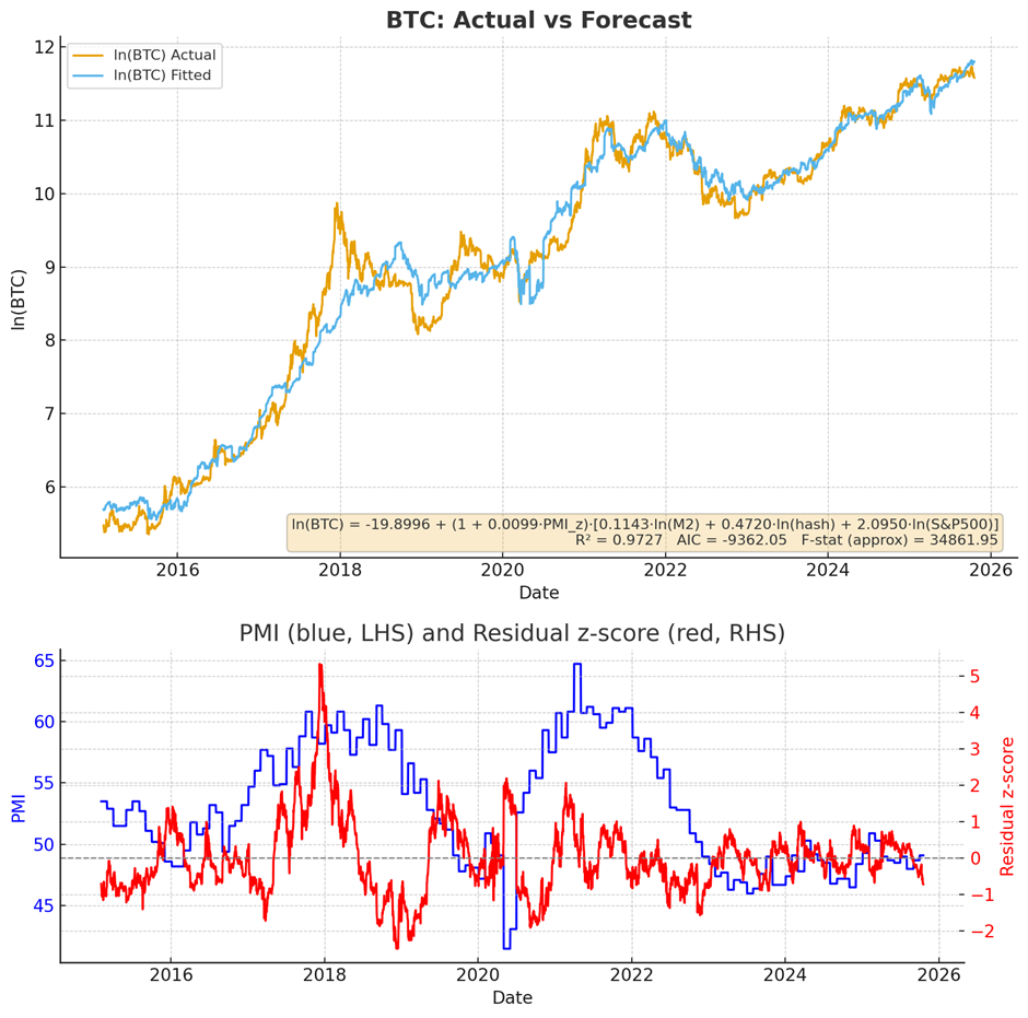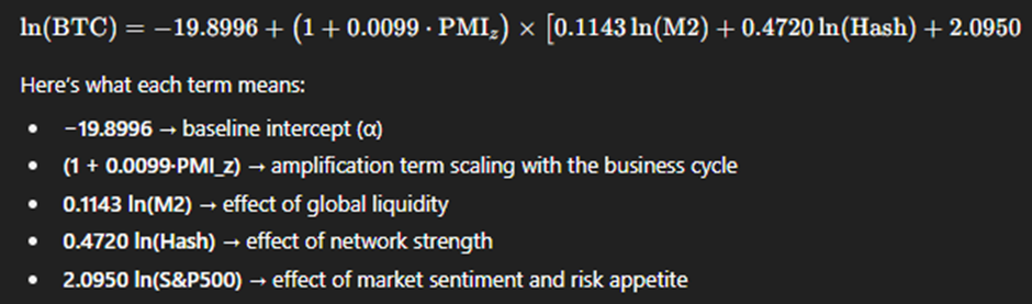 This baseline regression captures the broad structure of Bitcoin’s growth, yet it misses the amplitude of the major bubbles and busts. To fix that, we introduced PMI as a macro amplifier — scaling the combined influence of liquidity and risk variables.