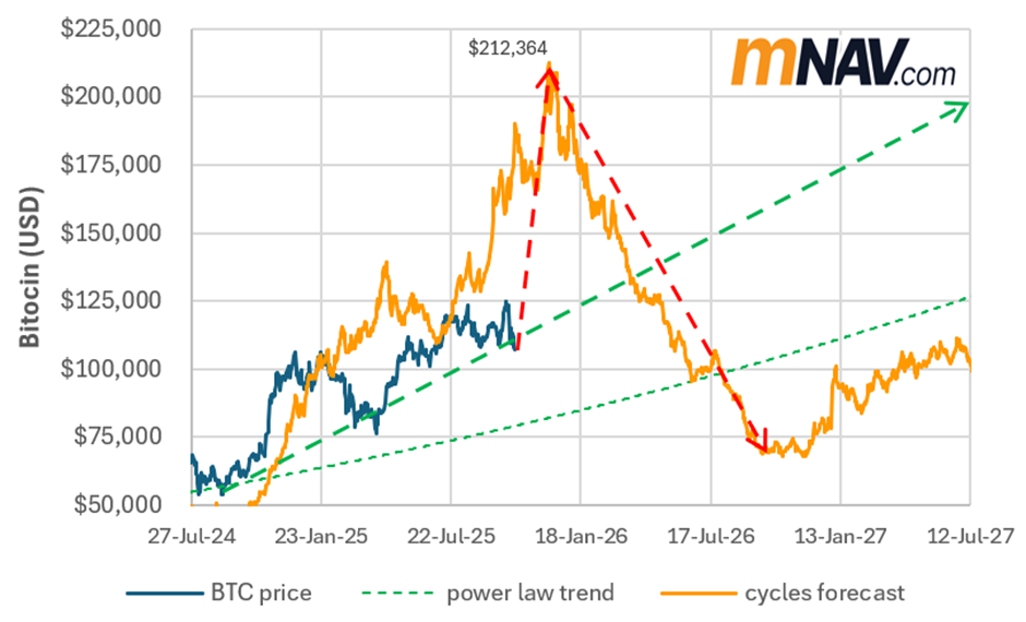· The model suggests Bitcoin won’t see another blow-off top until the business cycle peaks again.