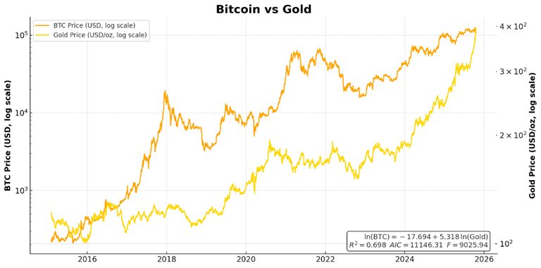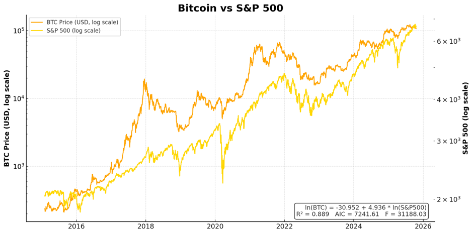Bitcoin also tracks the S&P 500 closely (R² ≈ 0.89), reflecting shared exposure to liquidity cycles and investor risk appetite. When monetary conditions loosen, both equities and Bitcoin benefit.
