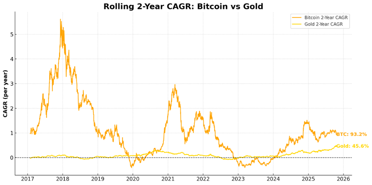 We often call Bitcoin “digital gold”, yet the correlation isn’t particularly tight (R² ≈ 0.7). Both assets are part of the debasement trade. While many bitcoiners are getting FOMO watching the gold chart, even over the past two years, while gold has been on a tear, Bitcoin’s current rolling 2-year CAGR of 93 % dwarfs gold’s 46 %.