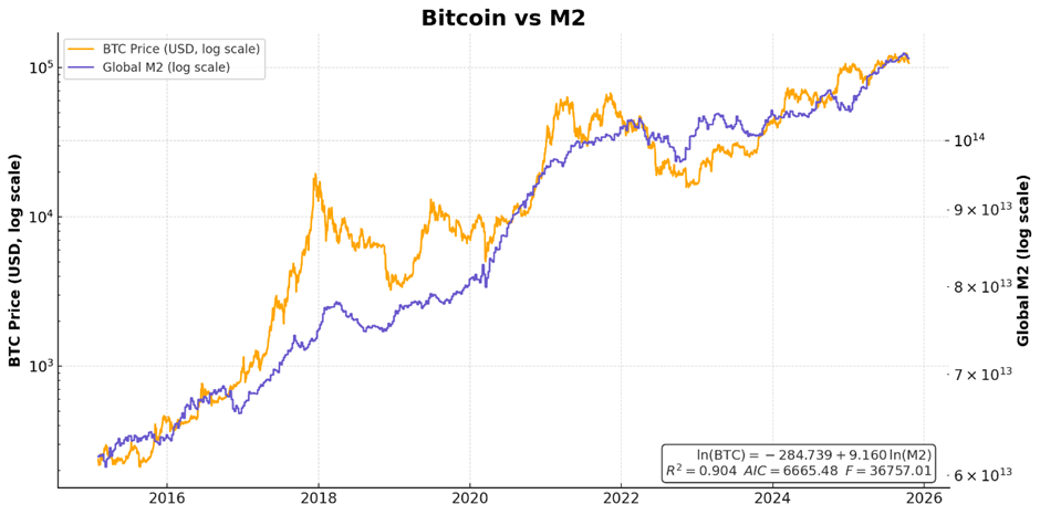 M2’s correlation with Bitcoin is striking (R² ≈ 0.9).