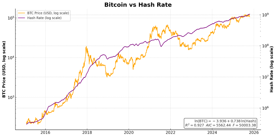 Bitcoin’s hash rate maintains the strongest single correlation (R² ≈ 0.93). It’s also a factor that isn’t tied directly to the broader economy, which is all interrelated (i.e., colinear).