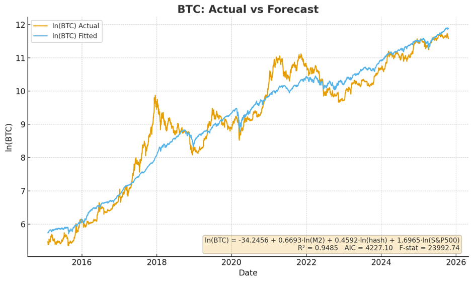 Combining these variables (M2, hash rate, S&P 500, and gold) yields a robust multivariate regression explaining Bitcoin’s long-term trend. Gold, however, contributes little incremental value and was therefore excluded from the final model.