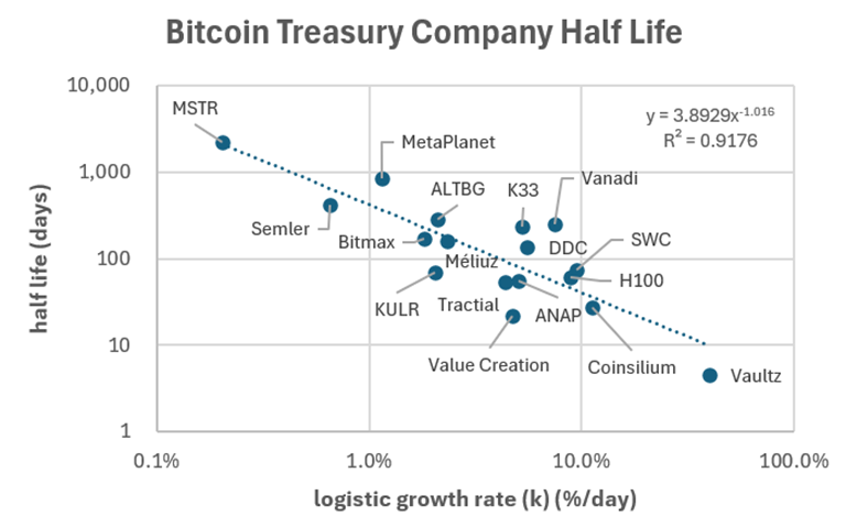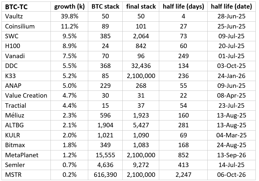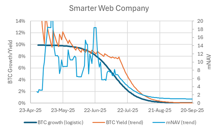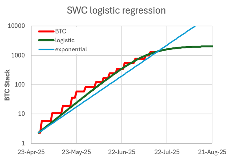 The regression analysis suggests that SWC will ultimately reach 1969 BTC, and their t0 (half life) is 73 days, meaning their growth rate started slowing on 9 July 2025.