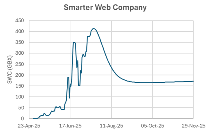Bringing all this together, we can forecast where the price of SWC might be if BTC continues to follow power law growth (i.e. about 30% p.a.). This bearish approach forecasts that SWC’s price will bottom out at 161 GBX in October before climbing slowly with BTC from there.