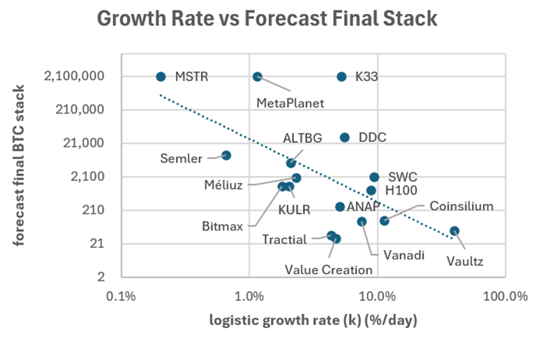 When we first started publishing the BTC Treasury Stacking Race chart, we got a few comments from astute observers that exponential projections were ridiculous. And they’re right. Eventually, growth has to slow, especially. There are only 21m BTC available!