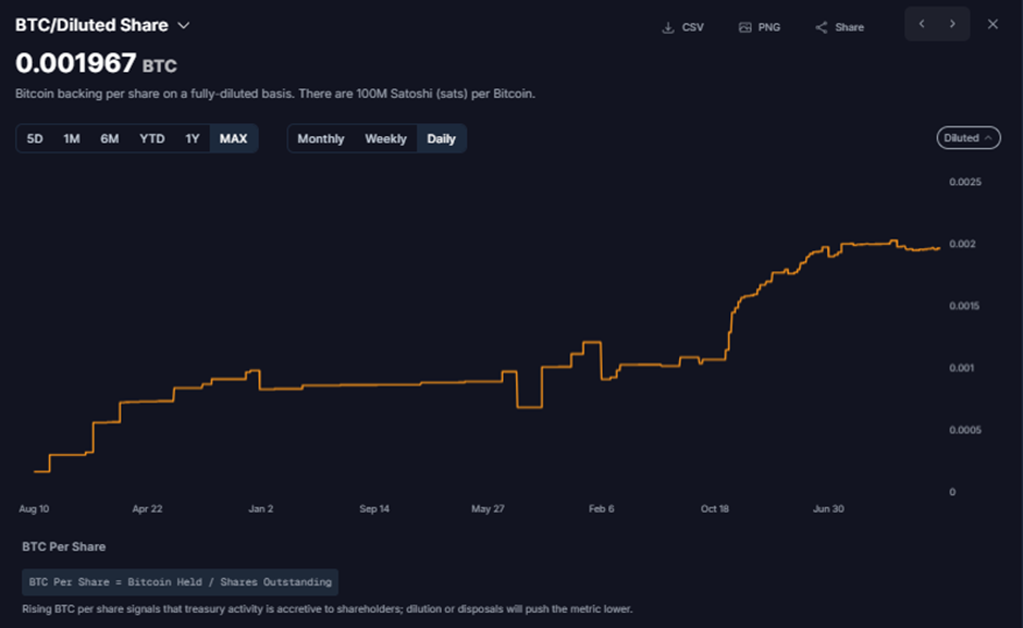 By default, the terminal focuses on BTC per fully diluted share — the metric we believe matters most.