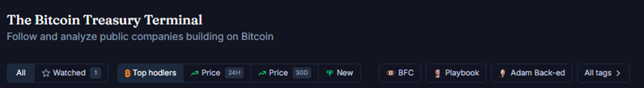 The terminal includes filtering tools that let users quickly explore different categories of Bitcoin treasury companies.