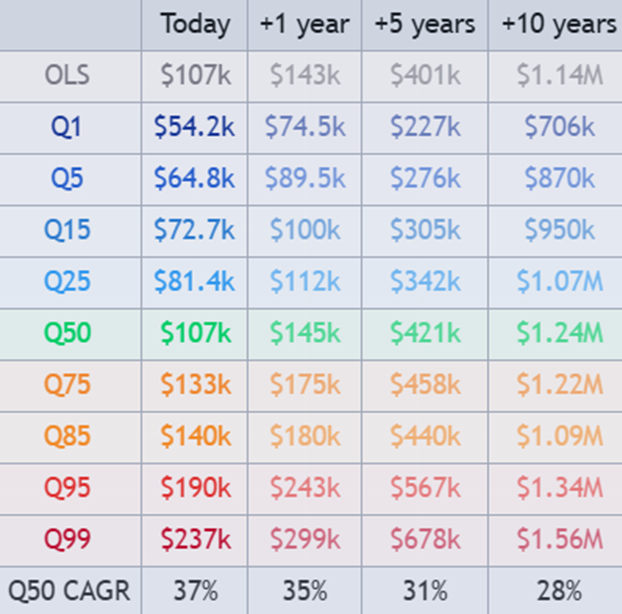 The model also shows the current Q50 CAGR, which is 37% p.a.; however, if Bitcoin reverts to its long-term mean from current levels, this will be much higher. The table shows that the Q50 trend is headed for $1.2m in 10 years, along with the quantile ranges that we can expect Bitcoin to trade within today and at 1, 5, and 10 years into the future.