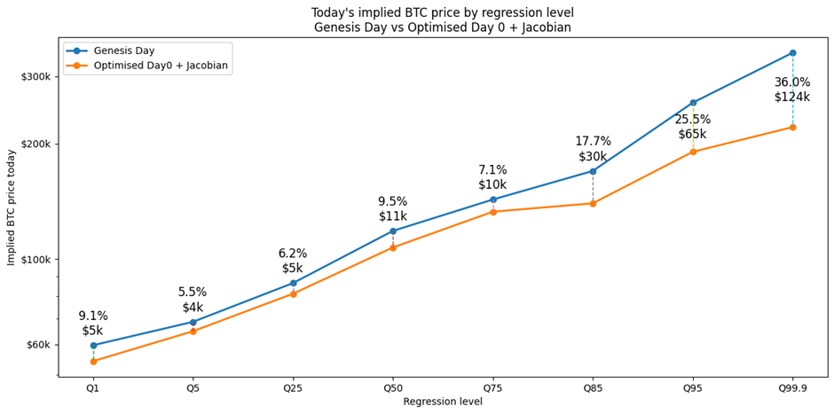 For readers interested in the statistical mechanics behind the model — including the mathematics of Jacobian weighting and Day-0 optimisation — we explain the full methodology here: Fixing the Early Data Bias in Bitcoin’s Power Law.